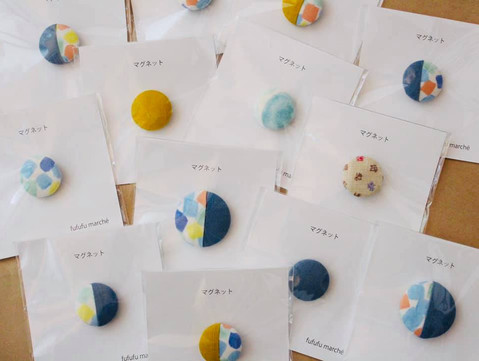 オリジナル生地を使ったくるみボタンやヘアゴム、クリップも販売します。